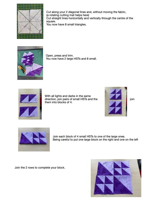 SO…. This month we are going to make 16 half squares triangles, using 2 contrasting fabrics and arrange them in any way you like.