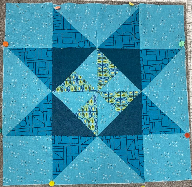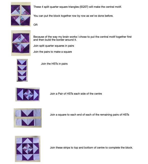 The eagle eyed amongst you will have spotted that the last photo shows a ‘variation’ to the traditional star block. The image below shows the usual block which is made by rotating the HSTs and strips before joining them to centre of the block as described in the last 3 steps above.