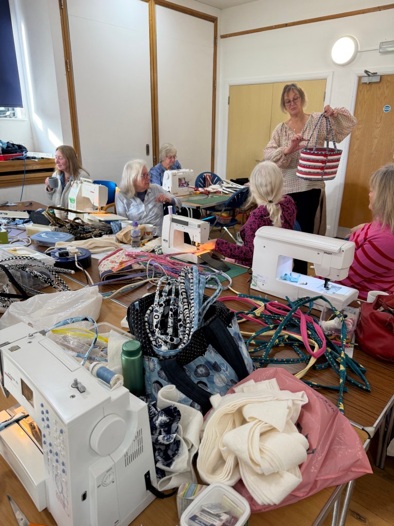 Today, 31st January, Bourne Quilters held their first ever bag workshop. What better way to chase away the winter blues than spending the day sewing with like minded people. There were four options available. A backpack, shopping bag with zipped pocket, small bag with drawstring top and a jelly roll bag. They were all demonstrated by our talented members Wendda, Valerie, Sandie and Lesley – many thanks to them for all their hard work. By the end of the day quite a few people had finished their bags and the remainder were well on their way. We look forward to seeing the finished items at ‘show and tell’ at our next meeting on Monday.