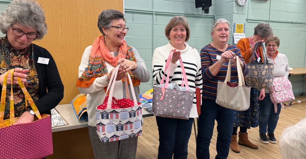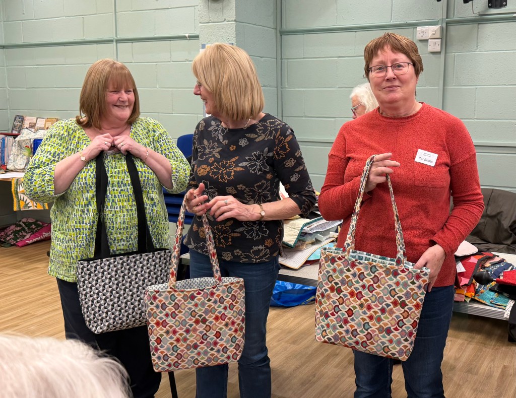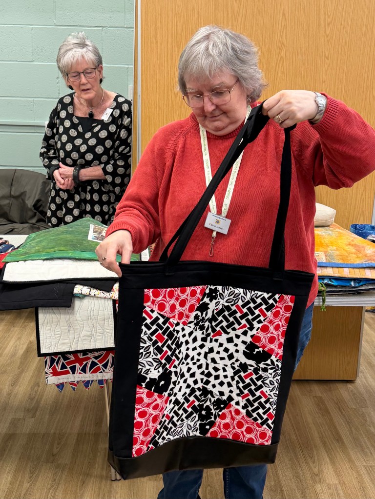 As well as quilts BQ members are prolific bag makers. Diana used hers to carry her quilt. Lisa had used an embroidery machine for her colourful hummingbird bag. Chris and Lesley showed off their makes following the trip to Lady Sew and Sew. Chris used some poppy fabric to make a bag for her sister. Lesley had purchased some panels and picked out a lovely contrasting colour for the lining.