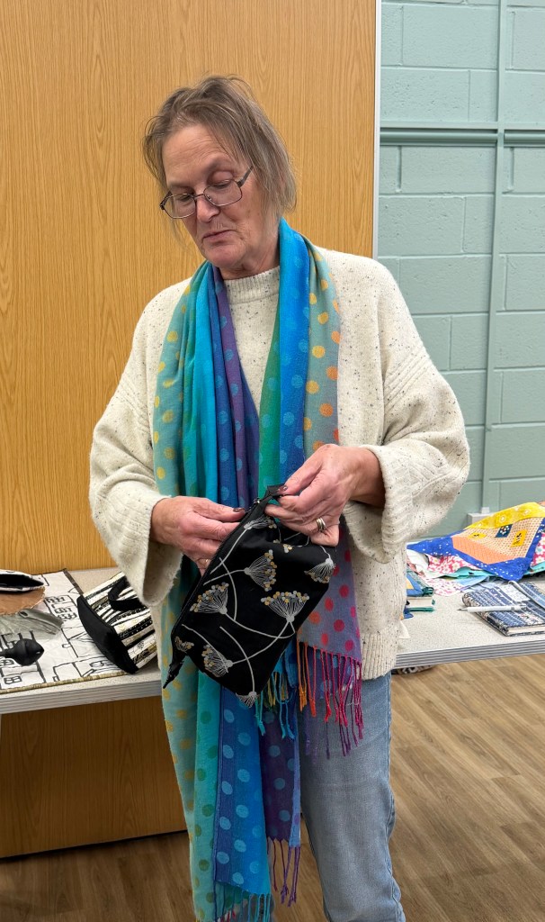 It is amazing how our members are inspired to make so many amazing items. Chris had a tuffet sewn from some of her father’s ties. Kathy had some bunting which she made from a pillowcase. Alice’s latest black and gold quilt was stunning. Gerry had been busy making dolls and brought along a selection for us to admire. I can’t imagine how long it took to crochet round the many rings it took to make the zipped bag!
