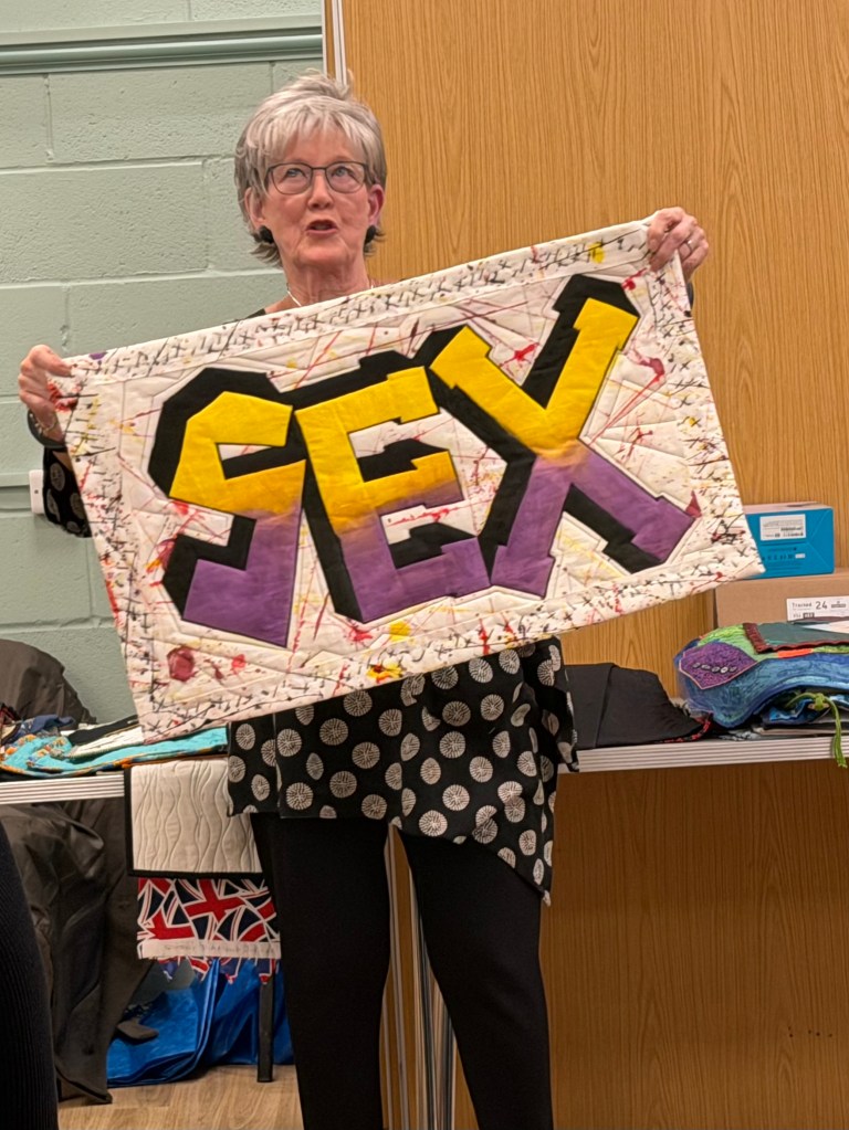 Wendda’s bag making journey continues with a pleather holdall. Gloria showed us how effective a limited colour palatte can be and, once again, Alice impressed us with her piecing and showing how much she deserves the ‘Master Quilter’ title.
