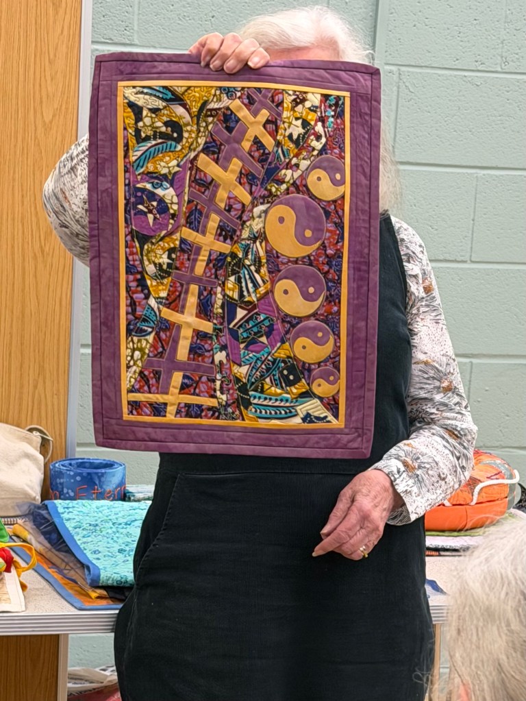 Quilts don’t need to be complex to be effective. Catherine had quilted a small whole quilt and Wendda had joined squares in a simple pattern. Interestingly both had chosen a lovely golden border to finish them off.